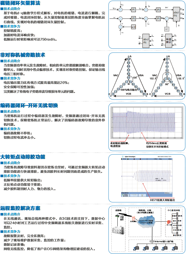 匯川技術致力于高性能高壓變頻器的探索,秉承對行業(yè)工藝的深入理解和對技術的極致追求,我們?yōu)橄鹉z行業(yè)帶來了全新的HD71密煉機專用高壓變頻器。HD71具備磁鏈閉環(huán)矢量算法、非對稱機械旁路技術、編碼器閉環(huán)-開環(huán)無擾切換、大轉(zhuǎn)矩點動排膠功能、遠程監(jiān)控解決方案等優(yōu)點,提高密煉機生產(chǎn)效率的同時降低能耗。大型傳動先鋒,共享卓越性能。