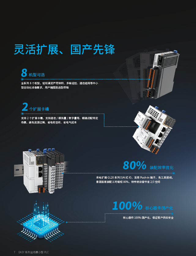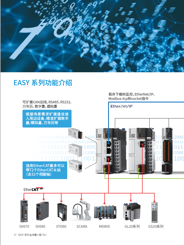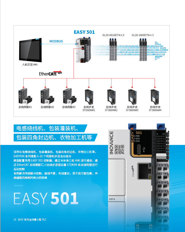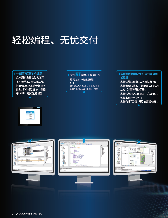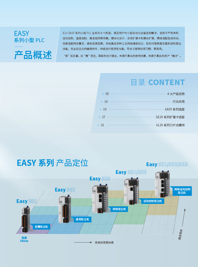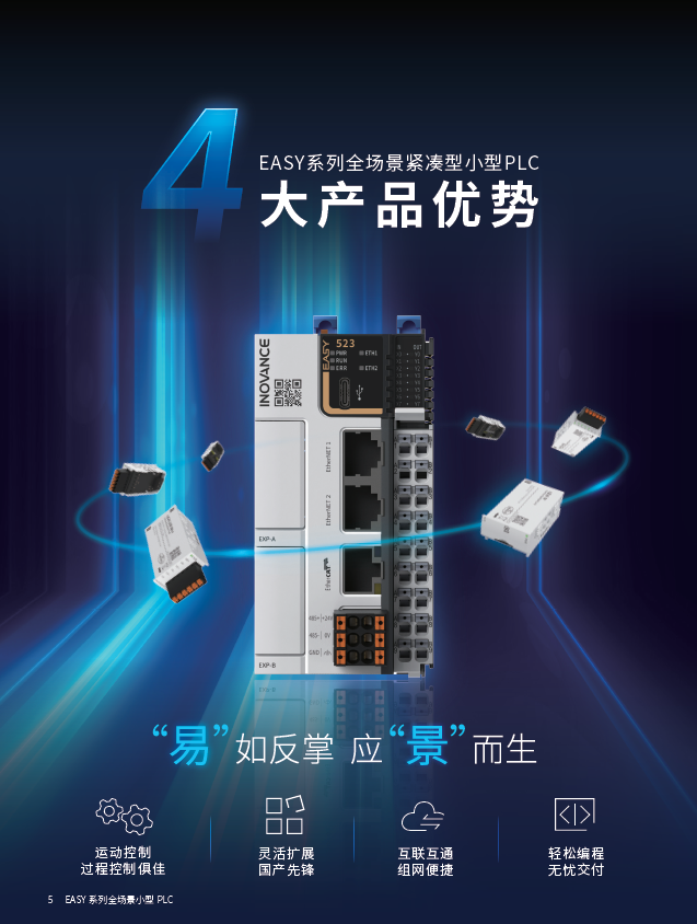匯川EASY系列全場景緊湊型中小型控制器全系列8個機型,滿足用戶對中小型自動化設(shè)備各種需求,適用于嚴苛體積、多軸運控、溫度控制、通信組網(wǎng)等場景。機身模塊化設(shè)計,支持擴展卡和模塊擴展,精準適配各類場合,完美適配特定需求,避免資源浪費。本地集成多種工業(yè)網(wǎng)絡(luò)通信協(xié)議,輕松對接數(shù)據(jù)采集系統(tǒng)和周邊設(shè)備。完全自主化的編程軟件,持續(xù)迭代易用性功能,符合工程師應(yīng)用習(xí)慣,更易用。 “易”如反掌,應(yīng)“景”而生,革新的設(shè)計理念,來源于真實的使用場景,來源于真實的用戶“痛點”。